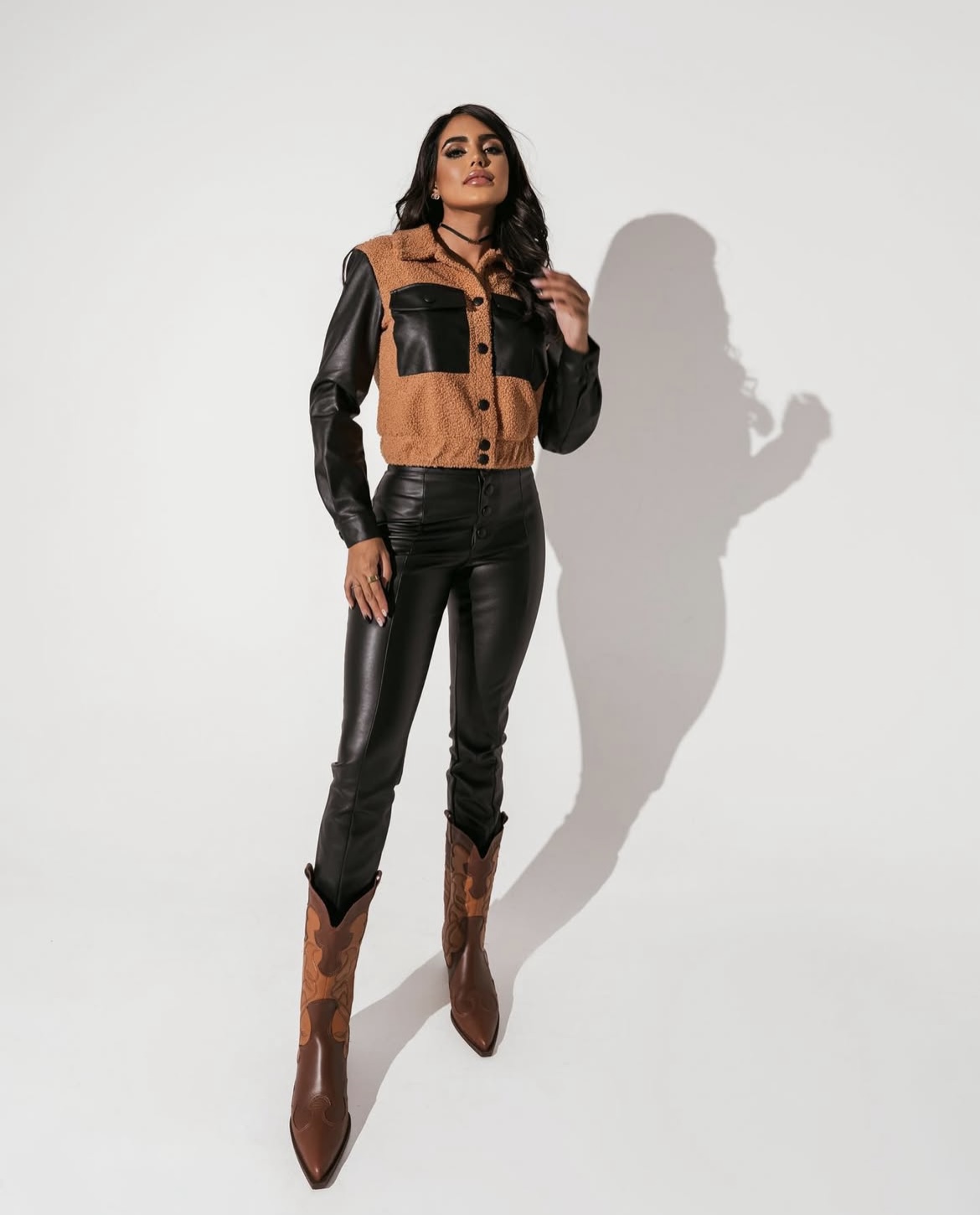 Esta jaqueta tem um estilo moderno que mistura texturas e materiais para criar um visual ousado e estiloso. Aqui estão os detalhes: